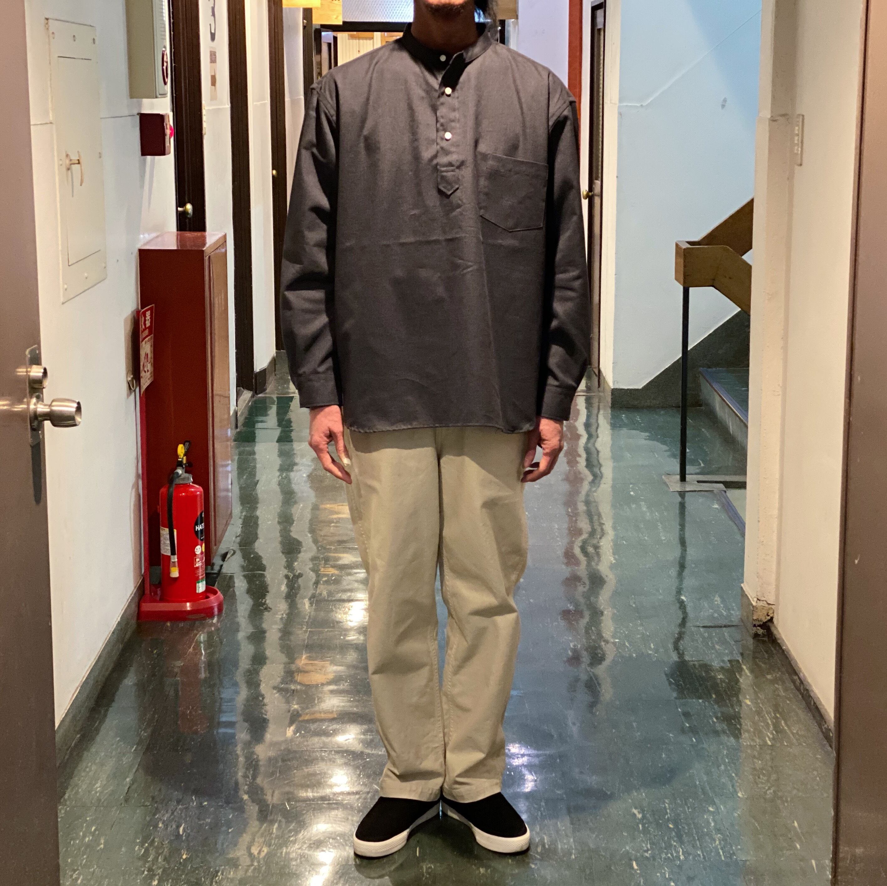 今風のややゆったりシルエットのプルオーバーシャツです。