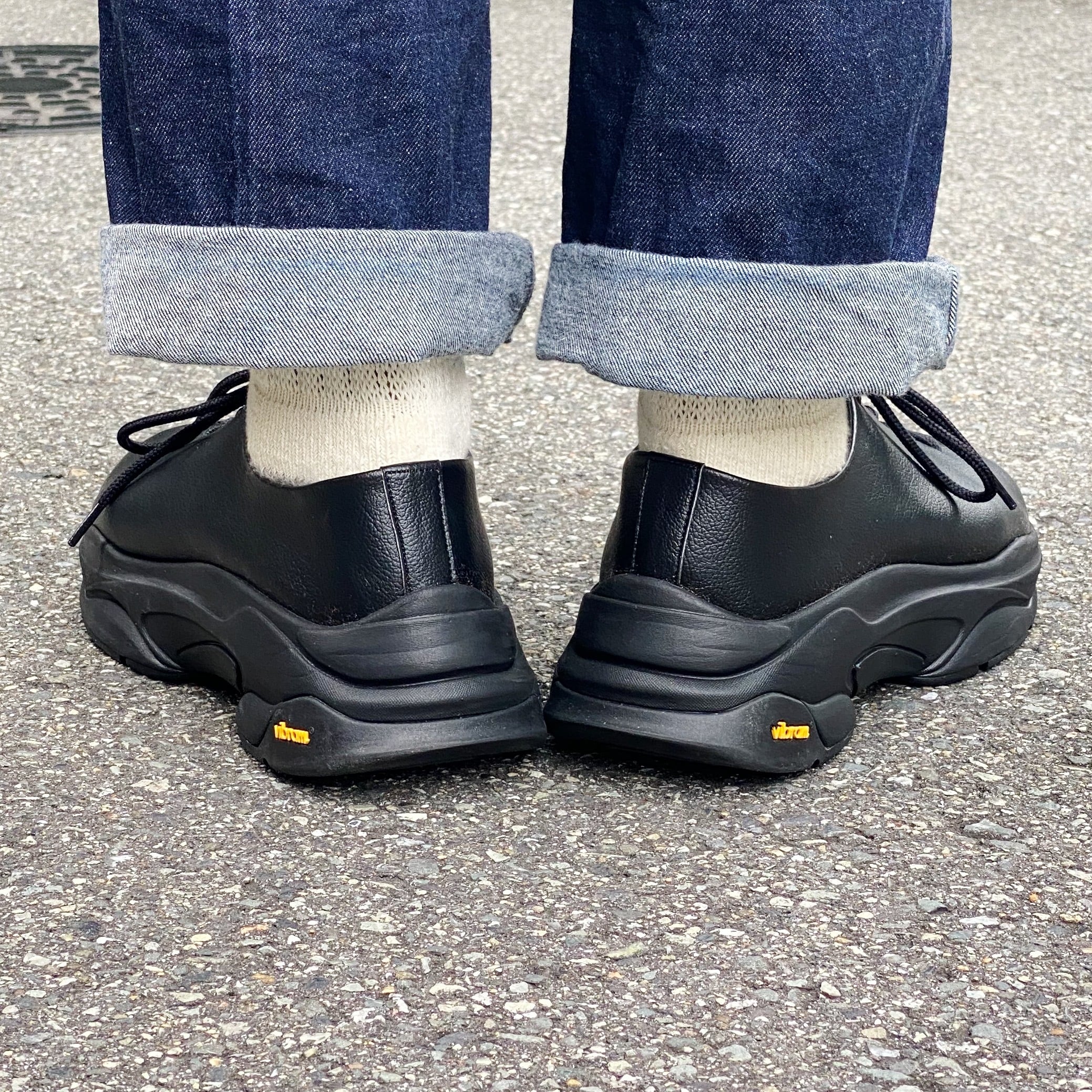 ビブラム社のソールを搭載。軽量スポンジ層のクッション性と、独⾃配合のラバーが持つ⾼い耐摩耗性の合成底です。